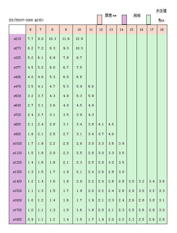 螺旋钢管水压值一览表